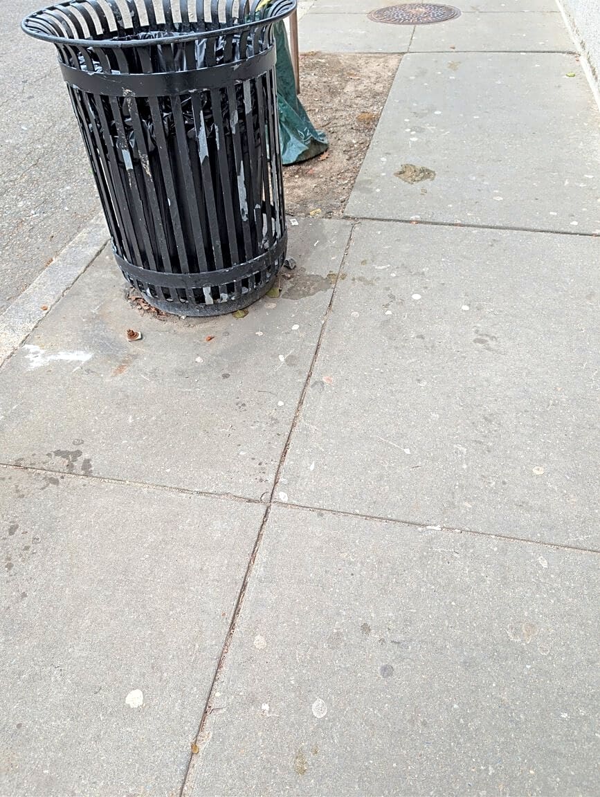 Intersection Of Cummins Hwy And James St, Hyde Park, MaPoop smeared all around trash barrel