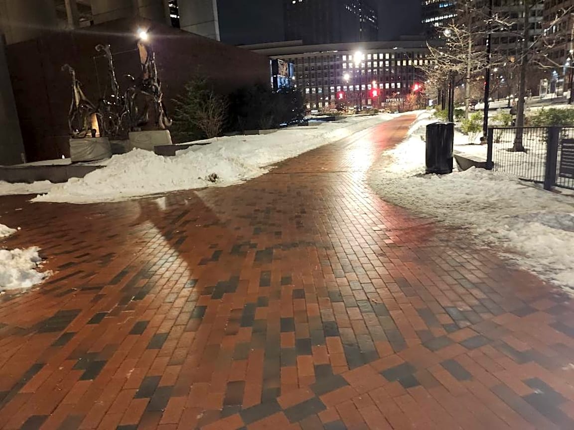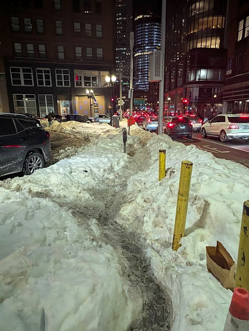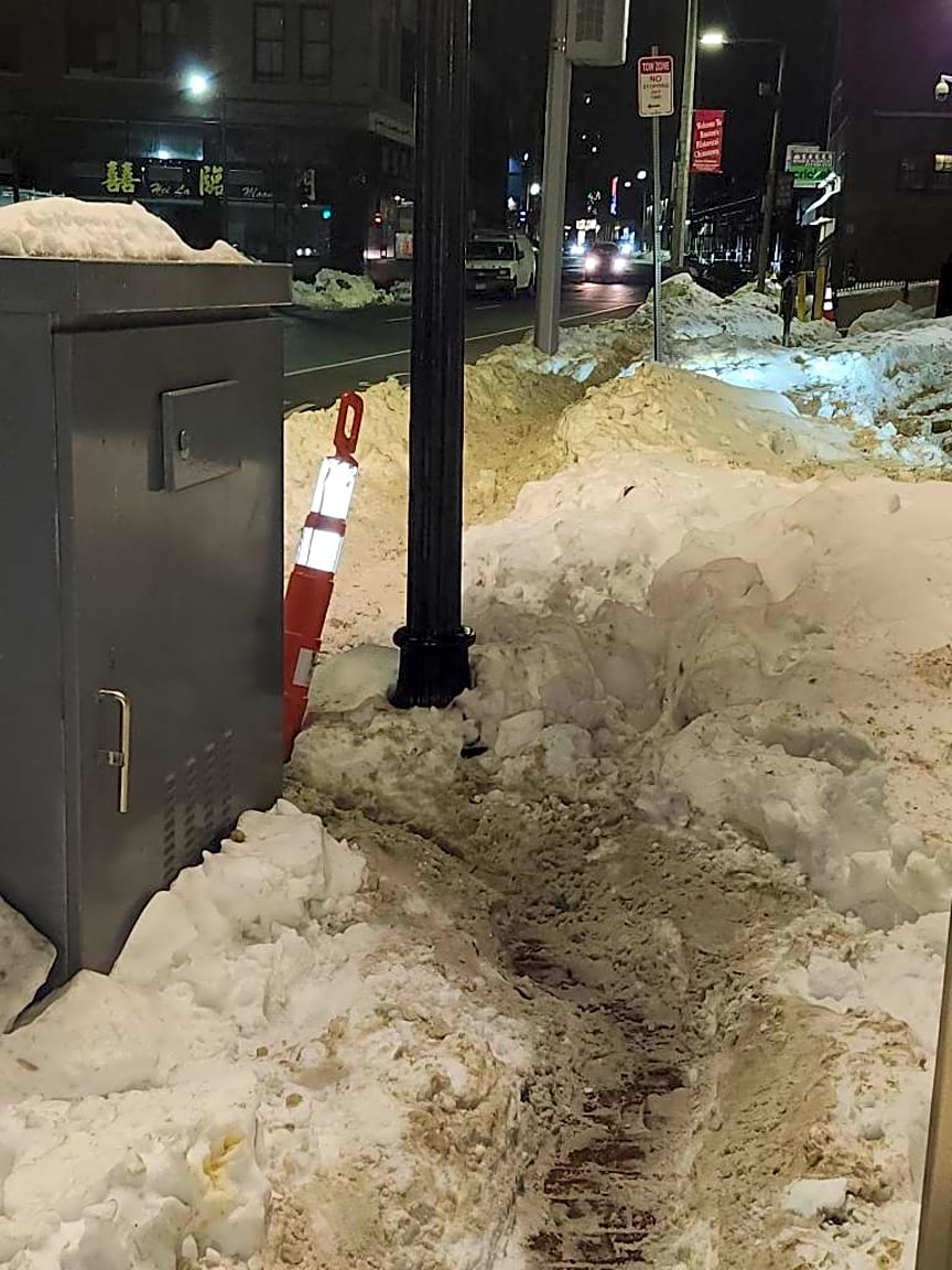 Intersection Of Kingston St And Avenue De Lafayette, Boston, MaLarge unshoveled area on sidewalk near Essex and Kingston