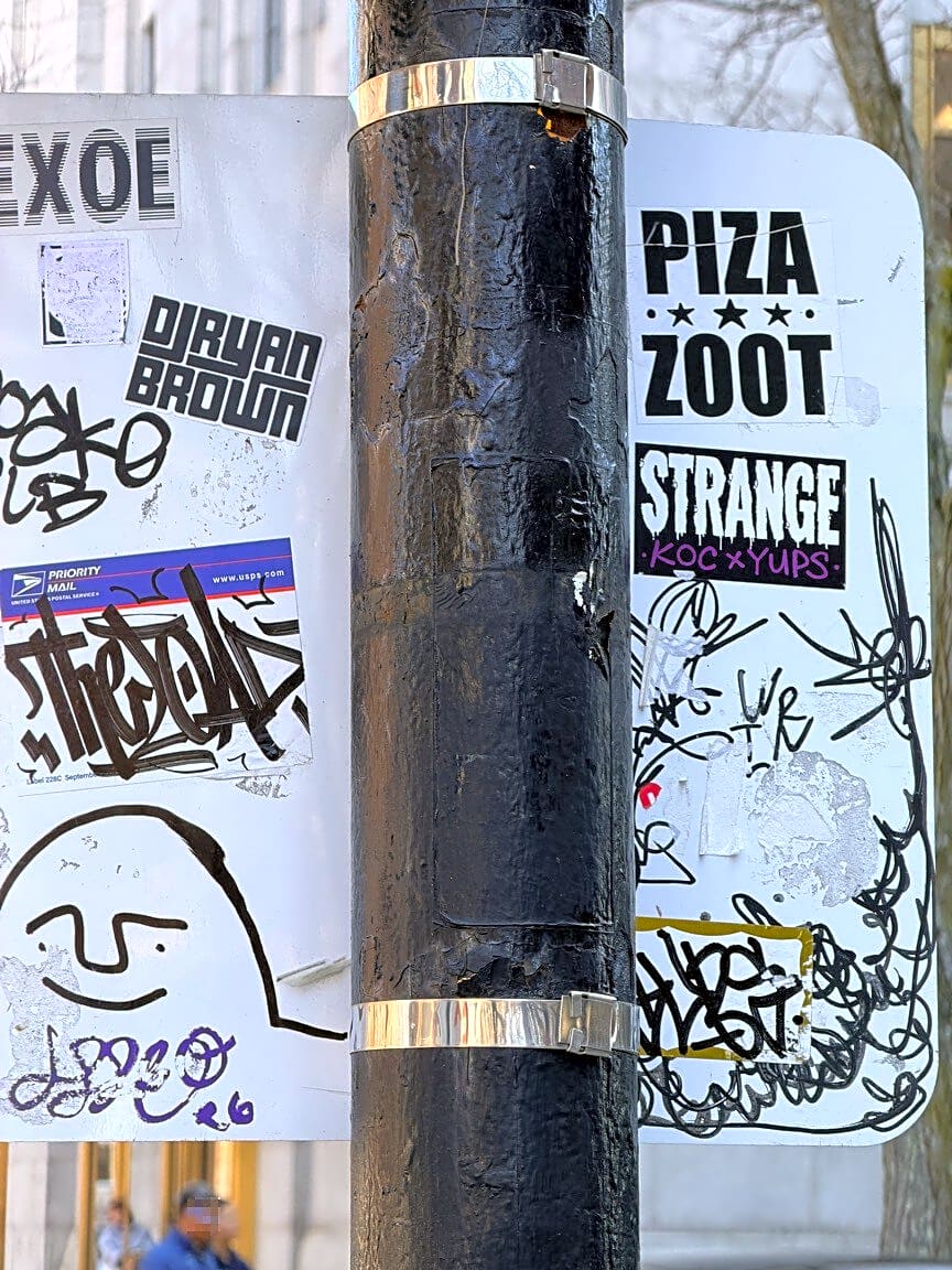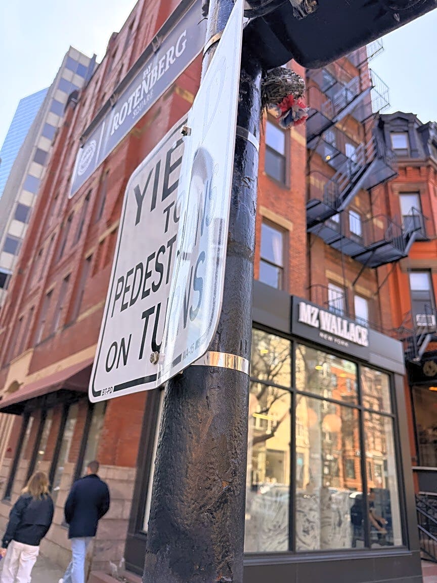Intersection Of Clarendon St And Newbury St, Boston, MaMass graffiti on BTD yield to pedestrians sign. Please remove